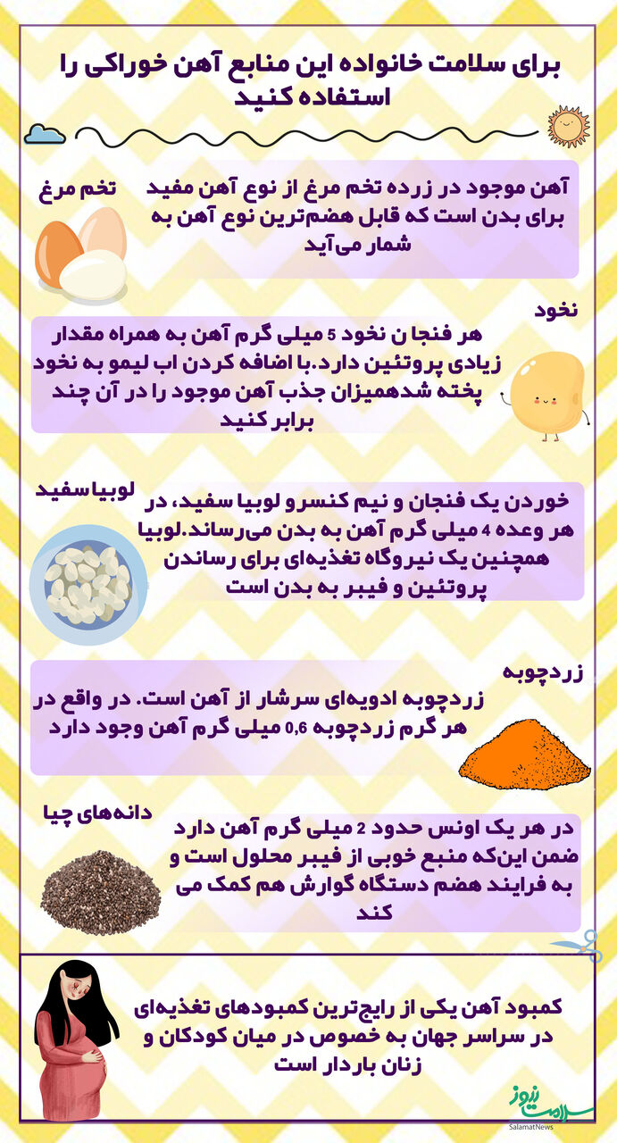اغلب می شنویم که زنان باردار باید اسیدفولیک استفاده کنند اما جنین علاوه بر اسیدفولیک به آهن نیز نیاز دارد و در صورت احساس کمبود، جنین از ذخیره بدن مادر استفاده می کند. در زمان زایمان هم خون زیادی از دست می رود و میزان آهن بدن پایین می آید. اگر چندقلو باردار هستید، بارداری پشت سر هم داشته اید یا به علت تهوع صبحگاهی بالا می آورید، مصرف آهن خود را افزایش دهید.