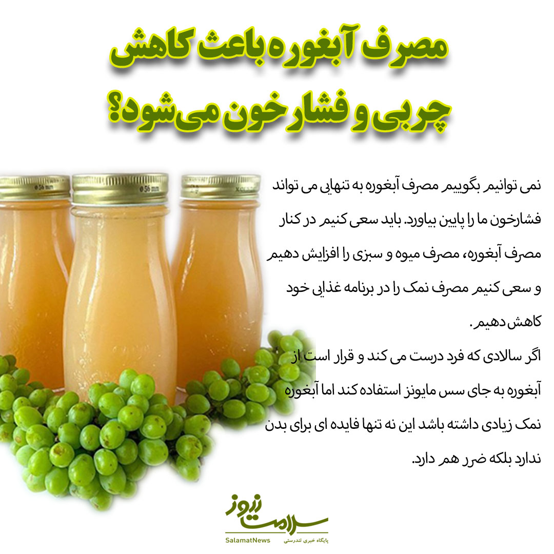 وی خاطرنشان کرد:« نمی توانیم بگوییم مصرف آبغوره به تنهایی می تواند فشارخون ما را پایین بیاورد. باید سعی کنیم در کنار مصرف آبغوره، مصرف میوه و سبزی را افزایش دهیم و سعی کنیم مصرف نمک را در برنامه غذایی خود کاهش دهیم. اگر سالادی که فرد درست می کند و قرار است از آبغوره به جای سس مایونز استفاده کند اما آبغوره نمک زیادی داشته باشد این نه تنها فایده ای برای بدن ندارد بلکه ضرر هم دارد.»